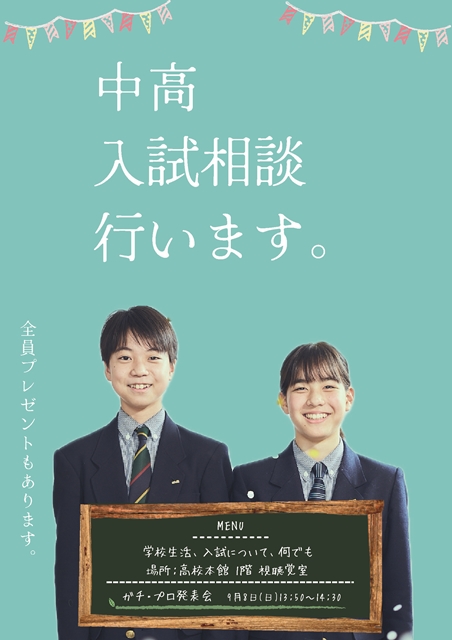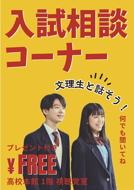 9月7日(土)~9月8日(日)開催の文理祭において、本校の学校生活や受験について個別にご説明&ご相談いただける中高入試相談コーナーを設置いたします。学校説明会等の運営を担当している『文理広報委員会』の中学・高校の生徒も常駐し、リアルな学校生活についてお話しさせて頂きます!