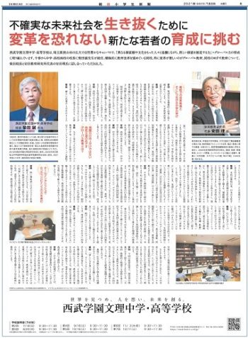 2021.07.09 中学 入試情報 その他 2021年7月8日付の朝日小学生新聞に、安田教育研究所 代表 安田 理氏と校長 柴田との対談インタビューが掲載されました。 本校の教育内容について、掲載いただいておりますの、でぜひご覧ください。 ▲画像をクリックすると拡大します