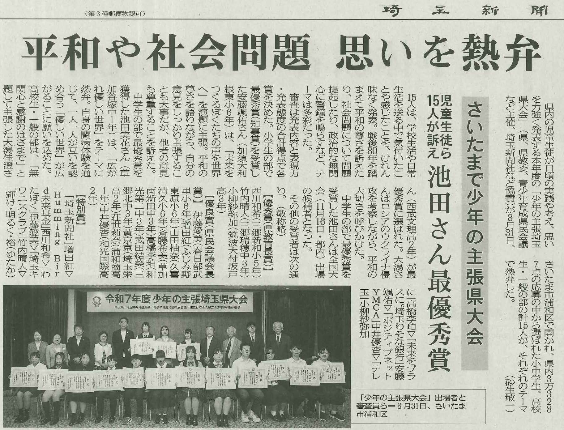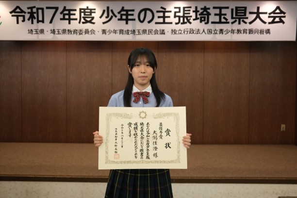 令和7年8月31日(日)、さいたま共済会館で「令和7年度 少年の主張 埼玉県大会」が開催されました。今年度の応募総数は、3万3287点。発表内容・表現力・発表態度の3観点で審査が行われ、本校の大潟佳澄さん(2-C2)が、高校・一般の部で『最優秀賞』に選ばれました。