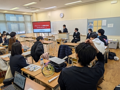 高校2年クリエイティブクラスにおける、公民科「公共」の授業において、一橋大学法科大学院の法教育サークルの皆様に、「プライバシー権と表現の自由」というテーマで法教育の出張授業を行っていただきました。