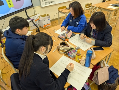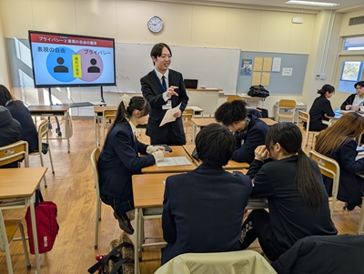 実際の判例をもとにした架空の事例をもとに、プライバシー権と表現の自由のどちらを優先すべきかを考える授業で、生徒はそれぞれの意見を交わしながら、難しい法的思考に必死に取り組んでいました。普段からディスカッションやプレゼンを多く行っている成果か、生徒の反応がよく、中には法科大学院性も想定していない視点からの意見も登場していました。